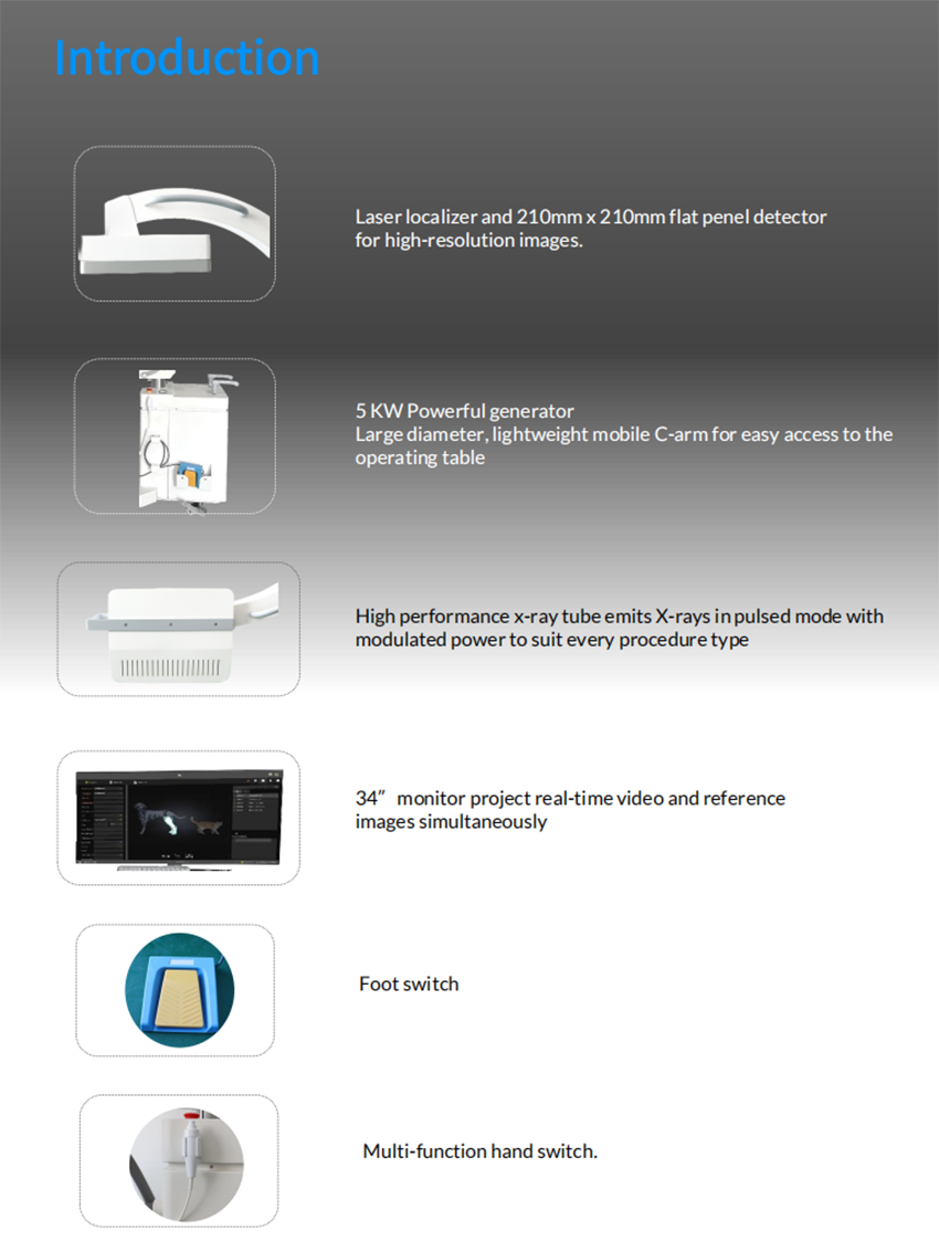 Veterinary C Arm X Ray Machine is designed for precise imaging in animal surgery and diagnosis. It features a 210 mm flat panel detector and laser localizer for clear high resolution images. The 5 kW generator and pulsed X ray tube provide stable performance. A large diameter mobile C arm allows flexible positioning. The 34 inch monitor displays real time images for efficient operation.